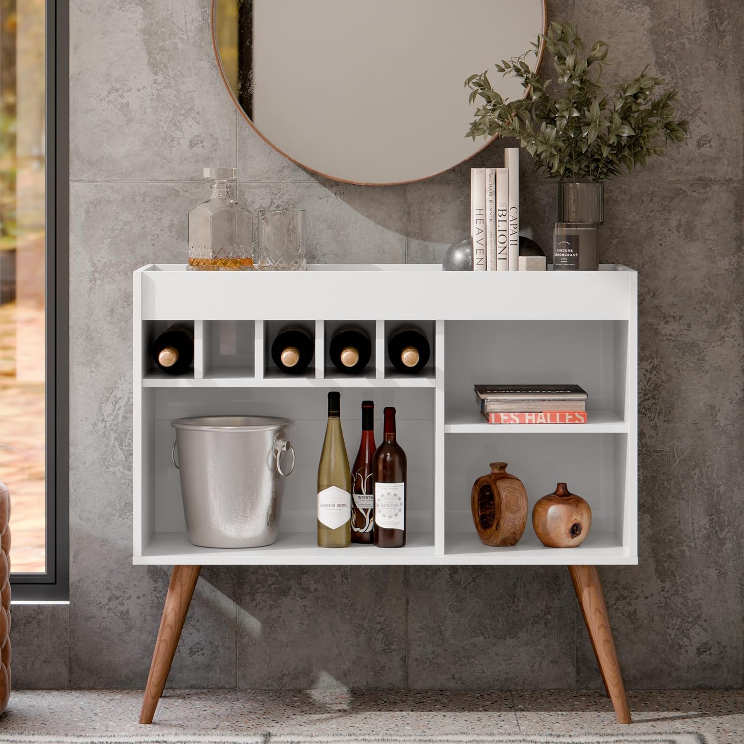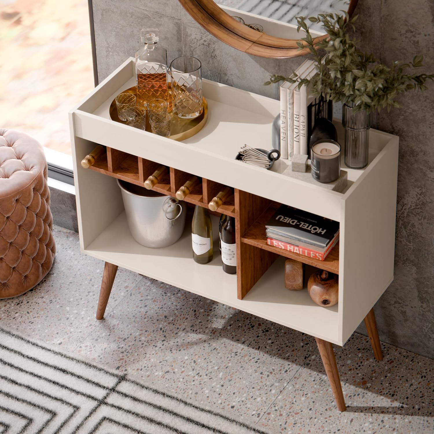 - Pés em formato cônico (retrô).