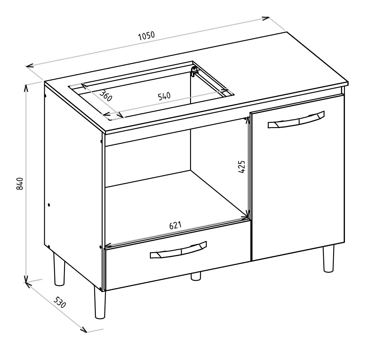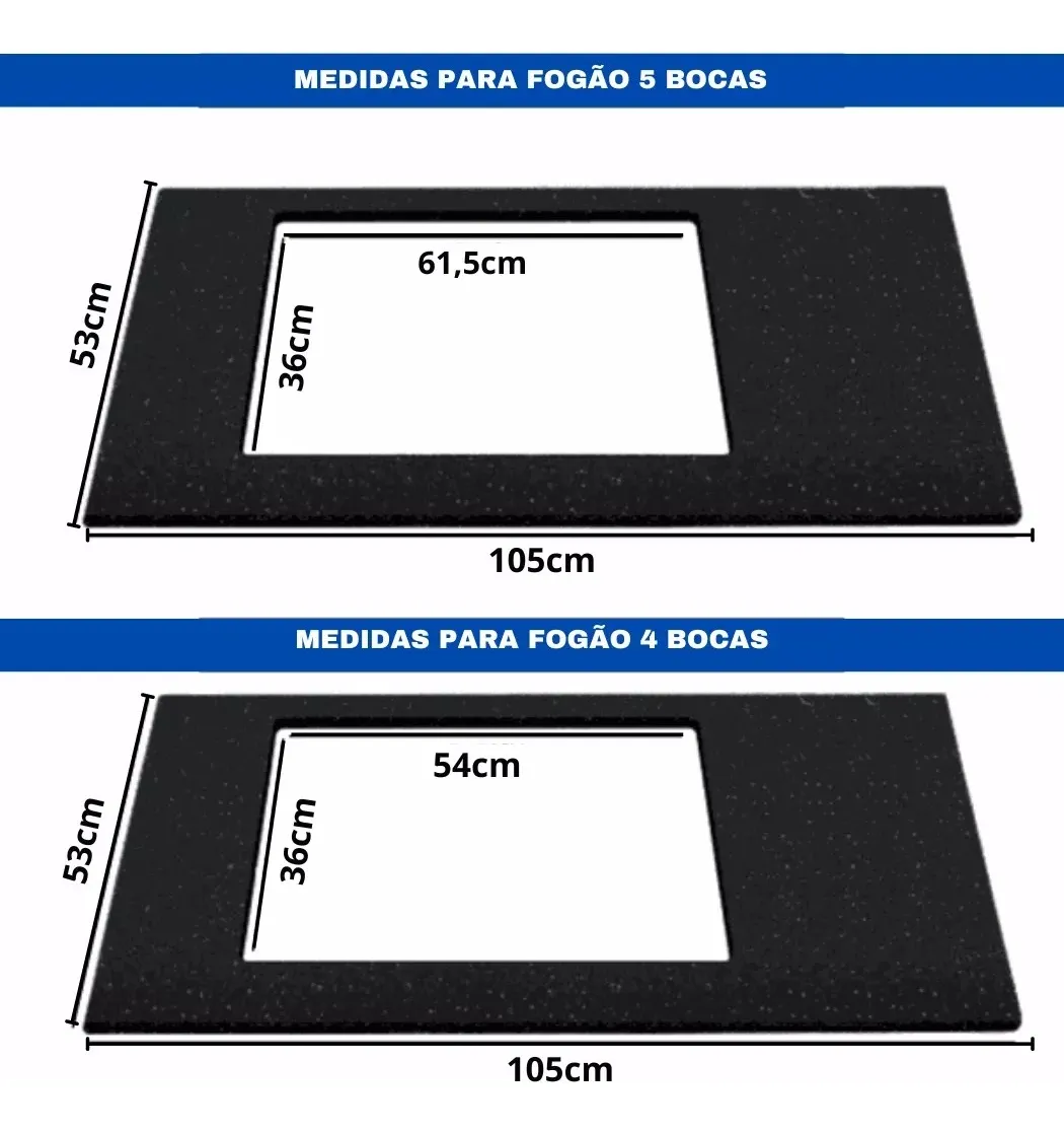 - Espaço para cooktop de 4 bocas: Altura: 36 cm | Largura: 54 cm