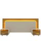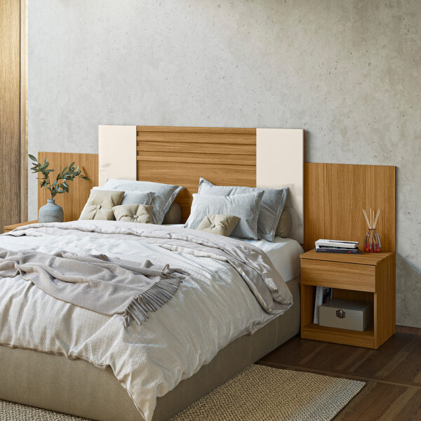 - Possui duas mesas de cabeceira com gavetas de design flutuante e cantos arredondados.