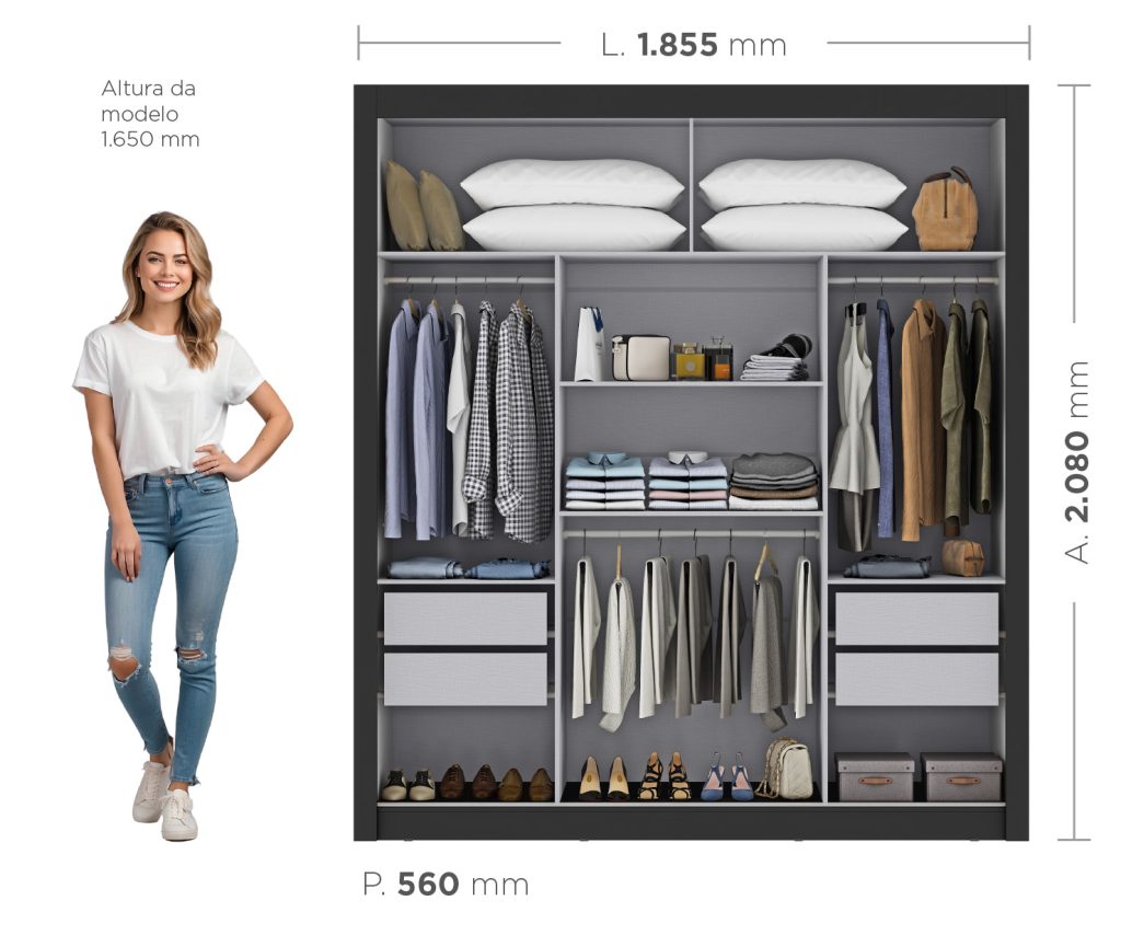 - Gavetas internas com corrediças telescópicas;